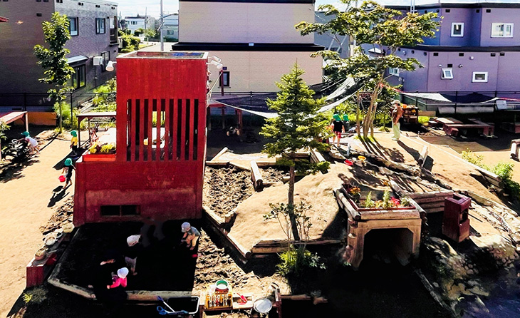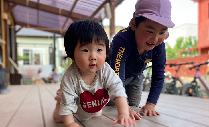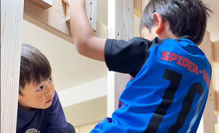 当園では園児たちがお互いに支えあってたくましく生活している姿が様々な場所やタイミングで見ることができます。園庭の遊具は職員や関わりのある人間の子どもたちに対する想いが詰まったものです。日々一緒に暮らす子どもたちの様子を見ながら、大人は過度な干渉はせずに見守ります。簡単に登り切れない仕掛けがあることで子どもたちの挑戦心をくすぐり、繊細な心の揺らぎを感じながら意欲や好奇心を育みます。大人も子どもも、遊具に挑戦している子どもに対しては手を貸すことはせず、苦戦しても自らの力で登りきることが出来るよう見守る様子が見られます。また、異年齢の関わりでは年下の園児に目線を合わせて関わる姿や遊びのルールを優しく教える姿も見られます。このような経験は、自分たちの生活に自ら関わりあって小さな『子ども同士の社会』を築く関係性につながります。